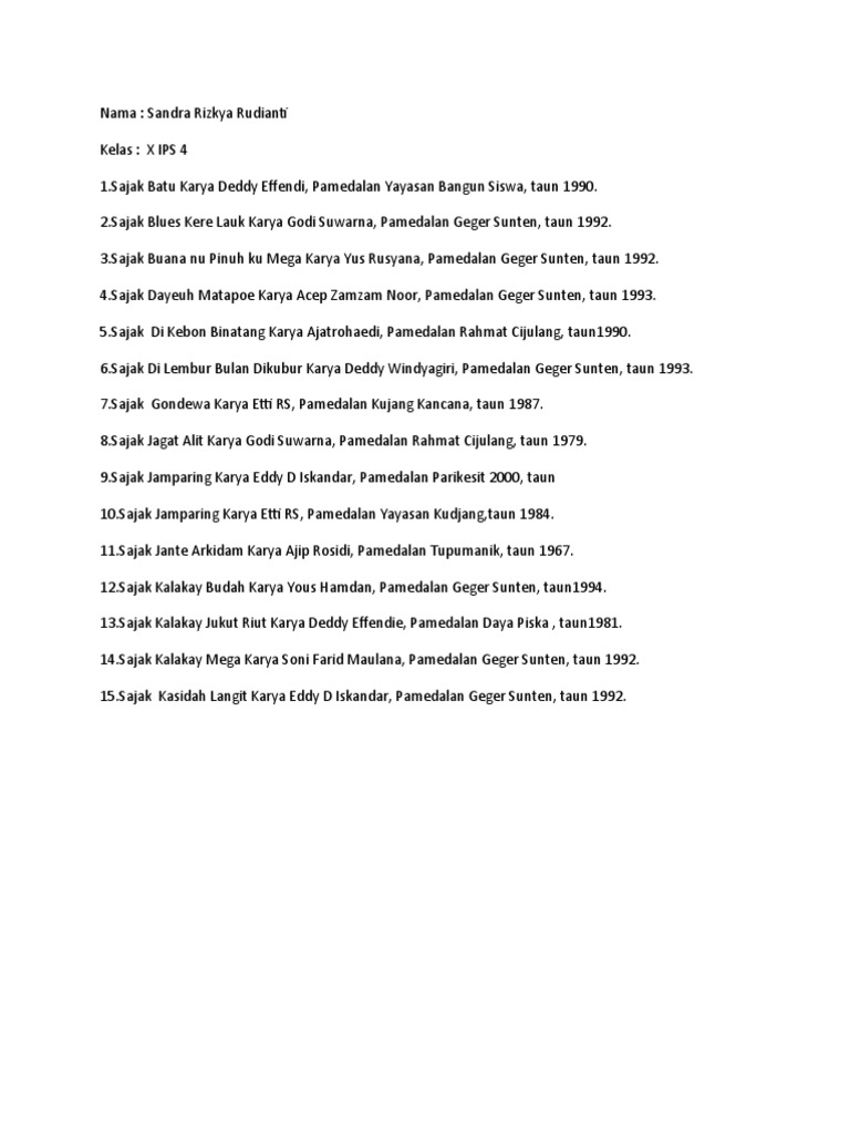 Sajak karya eddy d iskandar. Karana 57 LAGU HIRUP Karya. 54 Sajak Sumedih karya Unknow. Ka bhdieunakeun dituturkeun ku kumpulan sajak liana saperti Ombak Laut Kidul karya Rachmat M Sas Karana 1966 Jante Arkidam karya Ajip Rosidi 1967 Surat Kayas karya Surachman RM.