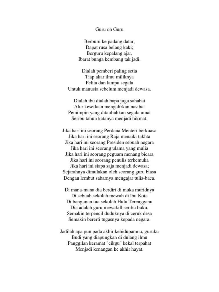 Terima kasih guru-guruku Pekerjaan rumah yang kau berikan kepadaku. Puisi Guru Berikut ini adalah kumpulan puisi untuk guru dan para pengajar di indonesia yang jasanya perlu kita apresiasi dalam usaha mereka membentuk karakter anak yang berguna bagi bangsa dan negara. Berikut adalah contoh puisi yang bisa di jadikan inspirasi untuk kamu dan telah disusun dengan lengkap.