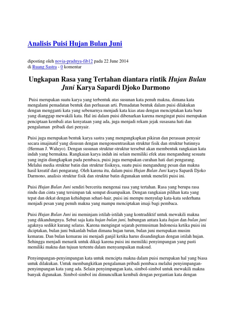 Sapardi menulis puisi Hujan Bulan Juni berdasarkan pengalaman yang tak muluk-muluk. 1 Analisis Stilistika dalam Kumpulan Puisi Hujan Bulan Juni Karya Sapardi Djoko Damono dan Relevansi sebagai Pembelajaran di SMA Abstrak Penelitian ini mengkaji tiga masalah yaitu 1 Struktur puisi-puisi dalam Hujan Bulan Juni 2 Analisis stilistika puisi-puisi Hujan Bulan Juni dan 3 Relevansi stilitika puisi- puisi Hujan Bulan Juni pada pembelajaran sastra di SMA. Sapardi Djoko Damono meninggal dikabarkan menghembuskan nafas terakhirnya pada pukul 0917 WIB.