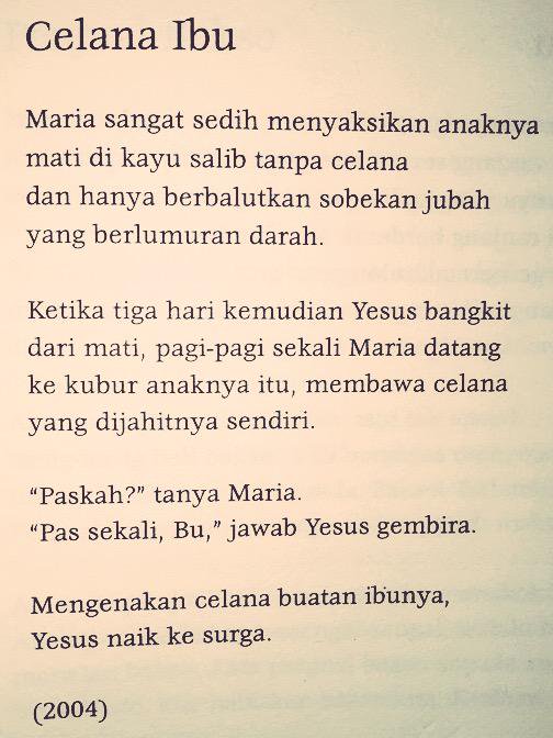 Sekalinya ada puisi yang membahas tentang hal serius Joko Pinurbo merangkainya dalam diksi yang terasa ringan tapi tetap bermakna dalam jenius. Puisi tak bermaksud endorse produk jajanan terkenal ketika lebaran ini hadir ke pembaca Januari 2020 dengan kembali menampilkan ciri khas Jokpin. May 02 2019 Ketika seorang penulis puisi menulis cerita akan terasa berbeda dan spesial.