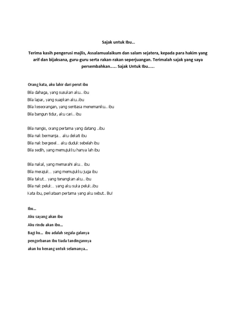 Ada banyak puisi tentang ibu yang bisa kamu baca sebagai bentuk rasa sayang. Tapi ingat jangan sedih berkepanjangan karena malah jadi penyakit baik moril spirituil atau fisik. 8 Puisi Ibu Sedih Mengharukan dan Ungkapan Sayang Untuk Ibu Memberikan ungkapan sayang untuk ibu berbentuk puisi merupakan hal yang wajar diberikan oleh seorang anak.